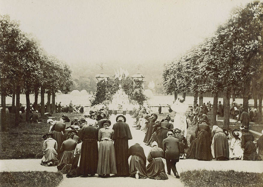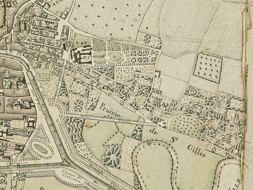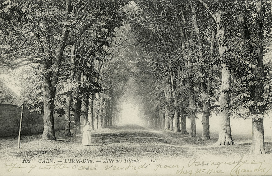 Si elle engendre la destruction de bâtiments de l’ancien couvent, l’implantation de l’Hôtel-Dieu a un impact positif sur les jardins dévastés par l’armée à la Révolution puis cultivés tant bien que mal par les reclus du dépôt de mendicité. La mise en location des jardins, y compris du potager, adjugée le 13 novembre 1821 à deux cultivateurs, assure leur remise état avant même l’ouverture officielle de l’institution. Dans son Mémoire (1826), le Dr J.-A. Trouvé vante les cultures et les pâturages, les arbres fruitiers et les plantes potagères d’un terrain de 14 hectares sur lequel pousse une végétation vigoureuse composée d’ormes, de tilleuls, de peupliers et de marronniers, plantés en avenue et en quinconce, qui préservent les pensionnaires malades de «la violence des vents et [de] l’ardeur du soleil». La communauté religieuse s’approprie également les jardins. Elle y aménage un belvédère offrant une vue imprenable sur « la vallée de l’Orne », tandis que les cours forment un cadre idéal aux processions organisées lors des fêtes religieuses. Les allées de tilleuls, qui bordent le jardin sur toute sa profondeur, se substituent en quelque sorte au cloître réquisitionné par le personnel de santé et deviennent autant de lieux de déambulation et de prière.
