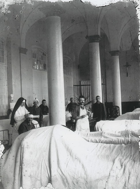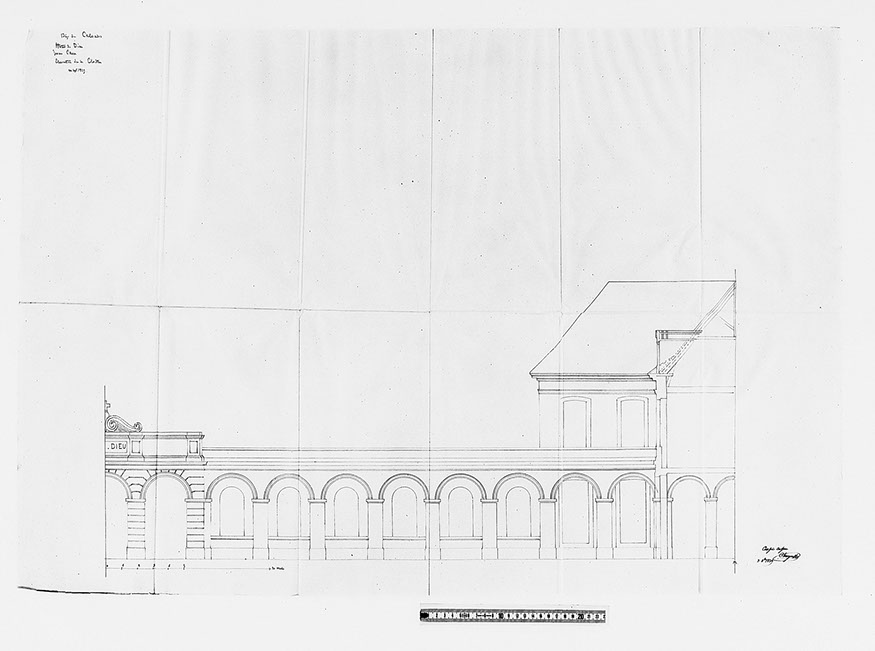 La reconversion du monastère de la Trinité en Hôtel-Dieu s’inscrit dans un phénomène de grande ampleur dans lequel les médecins et chirurgiens prennent, aux côtés des architectes-inspecteurs des Bâtiments civils, une part croissante dans les aménagements hospitaliers. Partie intégrante des soins thérapeutiques, les anciens bâtiments conventuels s’adaptent aux exigences de la doctrine aériste : l’intimité des malades est sacrifiée pour ne pas entraver la circulation de l’air, chaque salle est desservie par un escalier pour prévenir les risques épidémiques, l’accès au cours et promenoirs se fait par des voies distinctes. Etablis au rez-de-chaussée de l’aile ouest, les bains de vapeurs « à la Russe » et « sulfureux » sont proposés en plus des « bains domestiques » comme le rappelle le Dr J.-A. Trouvé.