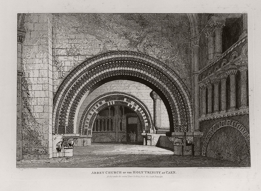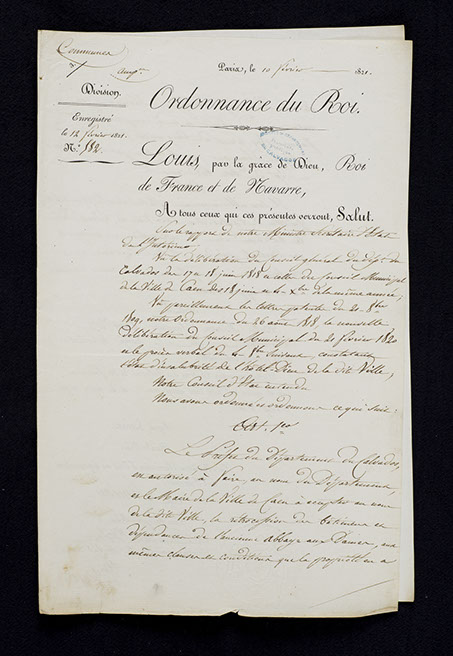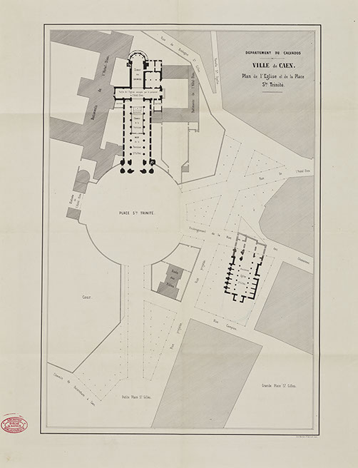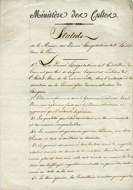 Vidés de leurs pensionnaires, les bâtiments abbatiaux à nouveau vacants en 1818 suscitent de multiples propositions de reconversion. Emu de la situation du « plus bel édifice de Caen menacé de ruine », le conseil municipal demande sa cession au Département, par délibération du 17 juin 1818, entérinée par ordonnance royale du 10 février 1821. Le 21 du même mois, il décide d’y transférer l’Hôtel-Dieu, fondé vers 1180 par Henri II Plantagenêt entre la rue Saint-Jean et l’actuel bassin Saint-Pierre, dont les bâtiments vétustes s’avèrent de plus en plus inadaptés. La translation s’effectue en grande pompe le 6 novembre 1823 après la rétrocession de l’ancien monastère à la commission des Hospices. Le choix du site recueille l’adhésion de la communauté médicale relayée par le Dr J.-A. Trouvé qui, dans son Mémoire sur la topographie médicale de l’Hôtel-Dieu (1826), vante son environnement exempt d’usines et la salubrité de l’air. Vingt-quatre religieuses cloîtrées de l’ordre des Augustins sont chargées de l’économie intérieure de l’hôpital, dont la capacité initiale fixée à 400 malades explose sous le Second Empire. La vocation de cet établissement de charité est d’accueillir en priorité les malades résidant à Caen, indigents et curables étant distingués en fonction de leurs ressources financières.