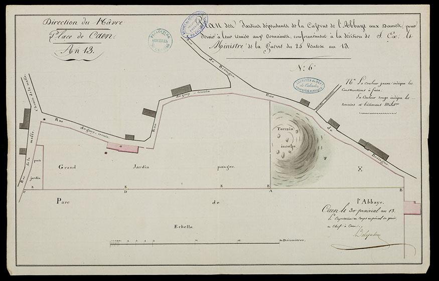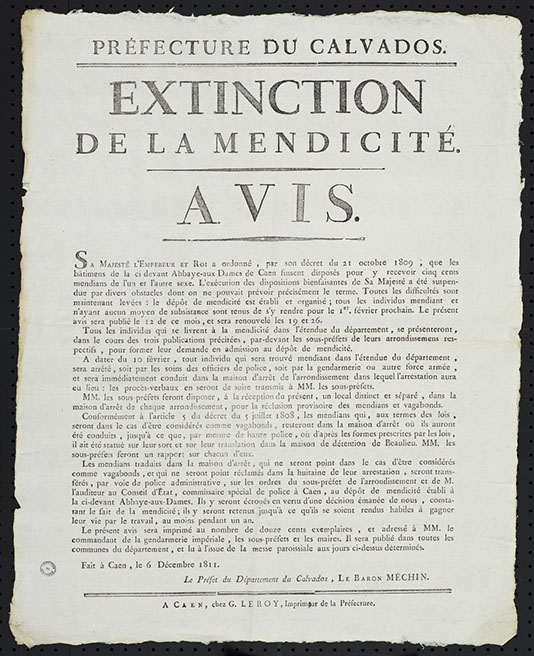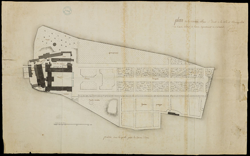 Siège de la 14e cohorte de la Légion d’honneur, le site monastique est choisi par le Conseil des Bâtiments civils pour y établir le dépôt de mendicité du Calvados à la suite du décret impérial du 21 octobre 1809. Cette institution, supprimée en 1790, ressuscite sous un autre nom les maisons de force instituées dans chaque généralité par arrêt du Conseil d’état de 1767. L’objectif reste le même : éradiquer la mendicité et la misère itinérante, offrir une assistance à une population en détresse incapable de subvenir à ses besoins. Les dispositions du code pénal de 1810 donnent un cadre juridique à la mise en œuvre de cette politique répressive. Le ministre de l’Intérieur missionne l’architecte Louis-Ambroise Dubut pour adapter l’ancien monastère à cette nouvelle dévolution. Cachots, salle de discipline, ateliers, réfectoires, cuisines, boulangerie, buanderie et bains sont ménagés dans l’église et au rez-de-chaussée des bâtiments claustraux, dont l’étage accueille les dortoirs. L’établissement ouvre le 1er février 1812 et connaît rapidement de graves dysfonctionnements. En cette période marquée par la disette, la mendicité ne fait que croître obligeant le dépôt caennais à accepter les mineurs. Sa suppression en 1818 révèle l’incapacité de l’autorité préfectorale à juguler la mendicité.