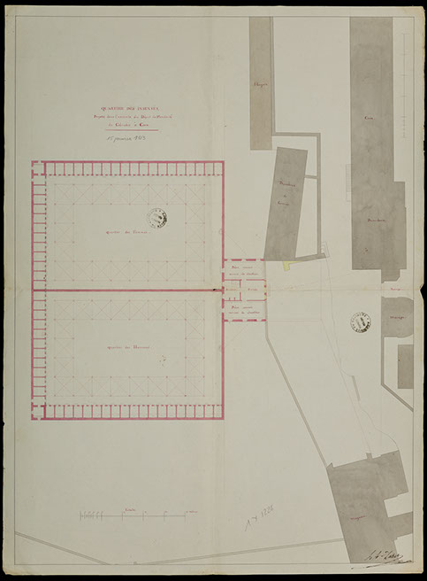 Dès avant la Révolution, les dépôts de mendicité ont développés une fonction d’assistance auprès des individus atteints de déficience mentale. A l’encontre des directives impériales, le dépôt de mendicité de Caen tente de diversifier son activité en élargissant l’accueil aux insensés jusque-là enfermés dans celui de la Maladrerie à Beaulieu. Le 15 janvier 1813, l’architecte Dubut fournit un devis pour le quartier des insensés à construire dans l’enceinte du dépôt de mendicité. Le projet, bien que non réalisé, reflète la part croissante de la fonction « hospitalière » de cette institution, encouragée à la fin de l’Ancien Régime. Son organisation, faisant coexister sur un même site mendiants et malades de l’esprit, marque une étape importante de la politique sociale et de l’assistance en France.