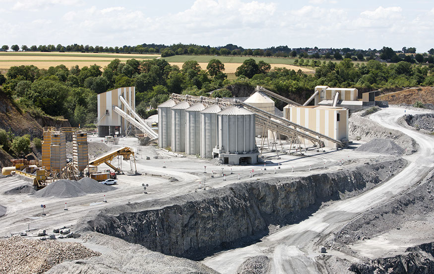 Installations de la carrière de la Roche-Blain, Fresney-le-Puceux. Les équipements de concassage du site de la Roche-Blain sont situés sur le plateau supérieur de la carrière et reliés à la route départementale 132. Ils rassemblent des installations de concassage primaire, secondaire et tertiaire qui réduisent successivement la granulométrie de la roche. 1 200 000 tonnes de granulats sont ainsi produites et commercialisées pour la fabrication de béton et d’enrobés. © Région Basse-Normandie – Inventaire général – Manuel de Rugy, 2011