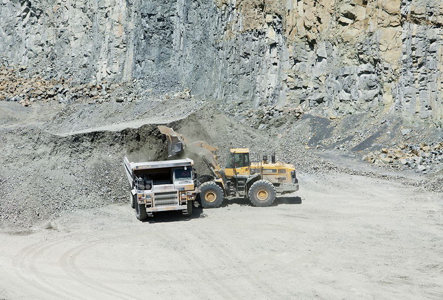 Chargement d’un dumper, Carrière à ciel ouvert de la Roche-Blain, Fresney-le-Puceux. Détachés du front de taille par tirs de mines, les morceaux de roche fragmentée sont acheminés aux équipements de concassage au moyen de dumpers. © Région Basse-Normandie – Inventaire général – Manuel de Rugy, 2011