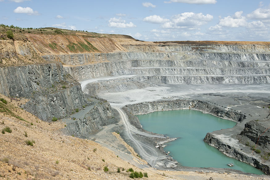 Carrière à ciel ouvert de la Roche-Blain, Fresney-le-Puceux. Valorisé depuis 1954, ce gisement de flysch est constitué d’une veine de grès quartzeux et de schiste précambriens aux nuances gris-bleuté. Son exploitation, passée de 80 tonnes par an à son origine à 1 300 000 tonnes autorisées depuis 1994, a dessiné une cavité de 100 mètres de profondeur inondée dans sa partie la plus basse. © Région Basse-Normandie – Inventaire général – Manuel de Rugy, 2011