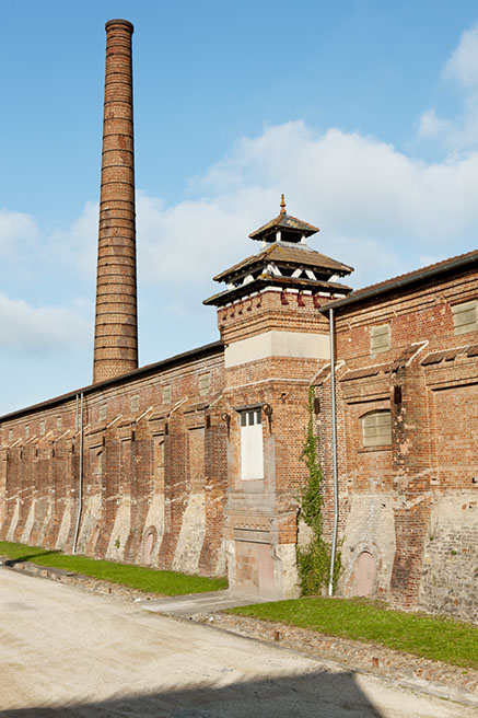 Bâtiment des fours, tuilerie du Fresne d’Argences, Argences. M. Grégoire, propriétaire vers 1872 de la tuilerie du Fresne d’Argences, a apporté une attention particulière à l’esthétique architecturale des bâtiments. Celui des fours Hoffmann, installés en 1876, est orné d’un clocheton à toit en pagode recouvert de tuiles vernissées. La cheminée de l’usine, élément de représentation, est composée d’un appareillage de briques colorées dans un camaïeu de rouge. © Région Basse-Normandie – Inventaire général – Manuel de Rugy, 2011