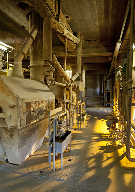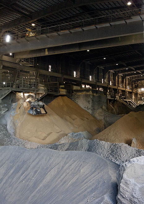 Intérieur du bâtiment du concasseur, cimenterie Calcia, Ranville. Le ciment produit dans les ateliers de fabrication de la cimenterie Calcia est le fruit d’une recette bien dosée, dont les différentes matières premières sont stockées dans le bâtiment du concasseur et dans plusieurs silos. Une fois broyés, le calcaire et l’argile, roches sédimentaires extraites à proximité de l’usine, sont additionnés de sable et d’oxyde de fer pour former le cru. Chauffé, celui-ci se transformera en clinker. © Région Basse-Normandie – Inventaire général – Manuel de Rugy, 2011