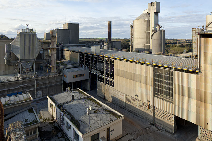 Vue des bâtiments de la cimenterie Calcia, Ranville. La vue d’ensemble permet d’observer l’articulation des bâtiments de la cimenterie, reflet de son processus de fabrication. Le regard circule, comme les matières transformées, du concasseur en arrière-plan vers le broyeur à cru, puis vers le bâtiment du four qui ferme l’image à droite. Au centre, le bâtiment blanc accueille le laboratoire où les échantillons de la production sont contrôlés. © Région Basse-Normandie – Inventaire général – Manuel de Rugy, 2011