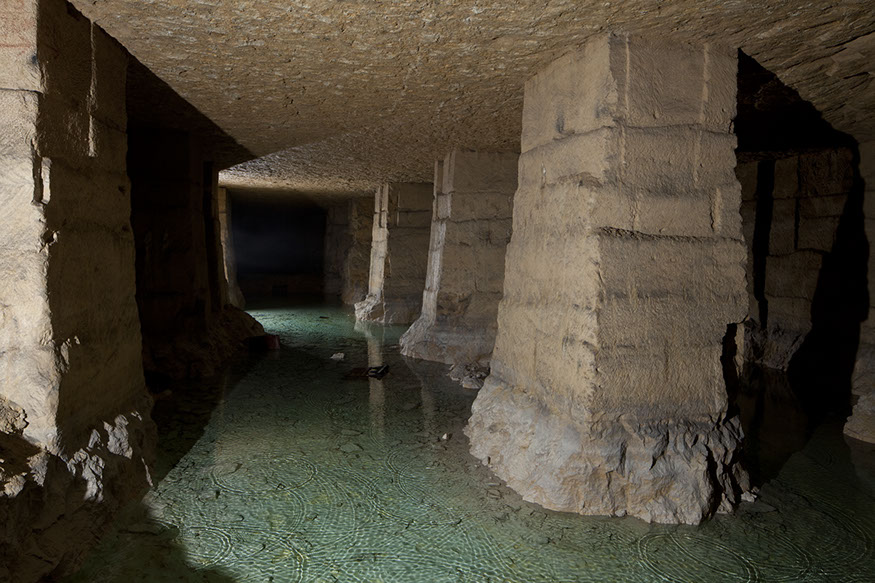 Carrières souterraines Docks Fouquet, Fleury-sur-Orne. Les carrières souterraines Docks Fouquet ont connu une exploitation industrielle de la moitié du XIXe siècle aux années 1970. Les carriers ont surcreusé les zones d’extraction pour atteindre les couches de pierre à chaux. Ce creusement, jusqu’à la nappe phréatique, aboutit à la formation d’une surprenante étendue d’eau de couleur bleu-vert. © Région Basse-Normandie – Inventaire général – Manuel de Rugy, 2012