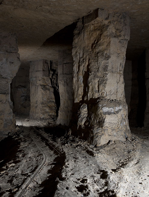 Carrières souterraines de la plaine de Caen, Cintheaux. Depuis 2004, la société des Carrières de la plaine de Caen extrait à nouveau de la pierre de Caen à Cintheaux. L’utilisation d’une haveuse avec bras articulé permet une coupe rectiligne des bancs. Celle-ci donne lieu à la constitution de larges couloirs de 3,2 mètres de haut et 6 mètres de large. Cette succession de plans verticaux donne à l’image une profondeur labyrinthique. © Région Basse-Normandie – Inventaire général – Manuel de Rugy, 2011