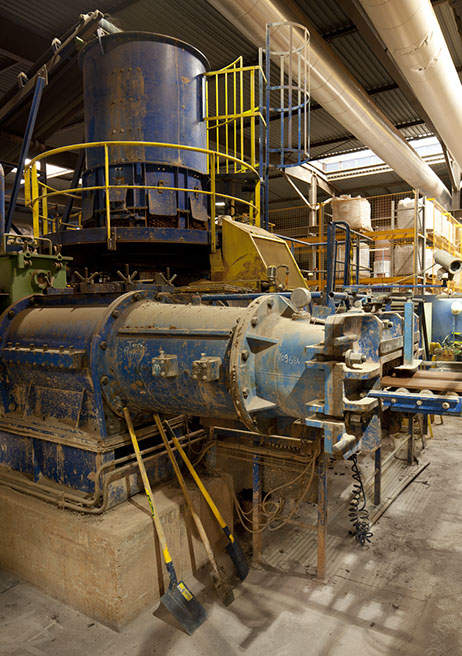 Extrudeuse, tuilerie Terreal, Bavent. L’extrudeuse, imposante machine, assure la transition entre l’atelier de préparation des terres et l’atelier de fabrication. L’argile broyée est humidifiée et malaxée pour constituer une pâte. Chargée dans l’extrudeuse, elle est moulée sous la forme d’un ruban dimensionné à la largeur des pièces à produire. Celles-ci seront ensuite partagées entre tuiles plates, dont l’usine de Bavent a fait sa spécialité, et tuiles mécaniques. © Région Basse-Normandie – Inventaire général – Manuel de Rugy, 2012