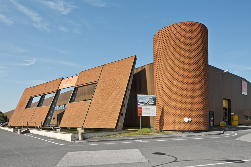 Atelier de fabrication et bureaux, tuilerie Terreal, Bavent. Le propriétaire de la tuilerie du Mesnil de Bavent, dont l’exploitation remonte à 1851, fait construire une nouvelle usine en 1998. Le bâtiment principal, de conception simple, est habillé de deux tourelles. L’effet décoratif est renforcé par l’adjonction d’un large panneau oblique fixé dans de petites douves. Ces deux principes ornementaux, d’inspiration médiévale, permettent de mettre en scène les tuiles plates fabriquées sur place. © Région Basse-Normandie – Inventaire général – Manuel de Rugy, 2012