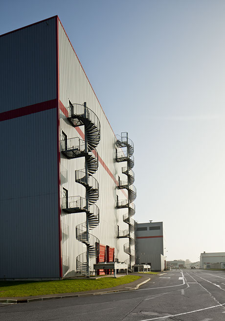 Usine de construction automobile, Renault Trucks, Blainville-sur-Orne. L’une des façades de l’atelier cataphorèse – peinture animée par deux escaliers hélicoïdaux. © Région Basse-Normandie – Inventaire général – Manuel de Rugy, 2012