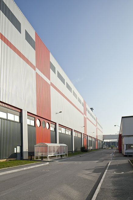 Usine de construction automobile, Renault Trucks, Blainville-sur-Orne. Le bâtiment abritant l’atelier de cataphorèse et de peinture est recouvert d'un essentage de tôle aux couleurs grise et rouge illustrant la marque Renault Trucks. © Région Basse-Normandie – Inventaire général – Manuel de Rugy, 2012