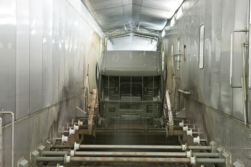 Usine de construction automobile, Renault Trucks, Blainville-sur-Orne. Sur la ligne de cataphorèse, les cabines sont plongées dans différents bains de nettoyage et de substances protectrices avant d’être colorées. © Région Basse-Normandie – Inventaire général – Manuel de Rugy, 2012