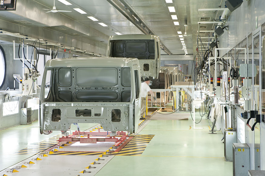 Usine de construction automobile, Renault Trucks, Blainville-sur-Orne. Les cabines sont placées en enfilade sur la ligne de garnissage. © Région Basse-Normandie – Inventaire général – Manuel de Rugy, 2012