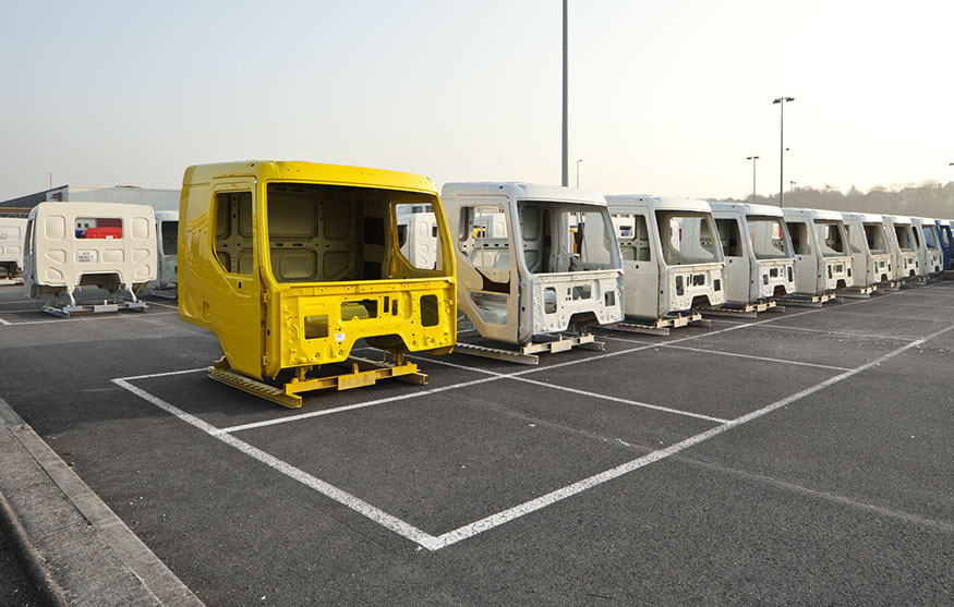 Usine de construction automobile, Renault Trucks, Blainville-sur-Orne. Une fois peintes, les cabines sont stockées sur un parking avant d’être garnies. © Région Basse-Normandie – Inventaire général – Manuel de Rugy, 2012