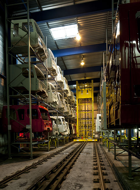 Usine de construction automobile, Renault Trucks, Blainville-sur-Orne. Une fois peintes et séchées, les cabines de type Magnum gagnent leur atelier de garnissage. © Région Basse-Normandie – Inventaire général – Manuel de Rugy, 2012