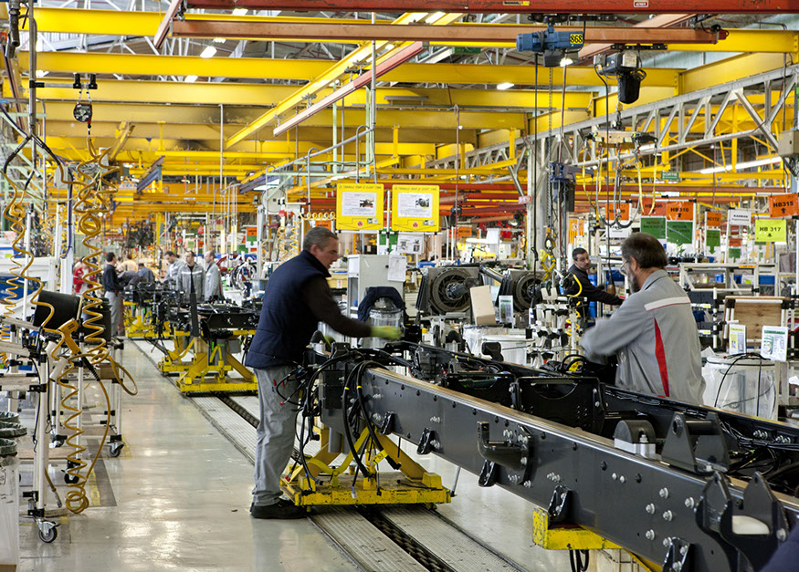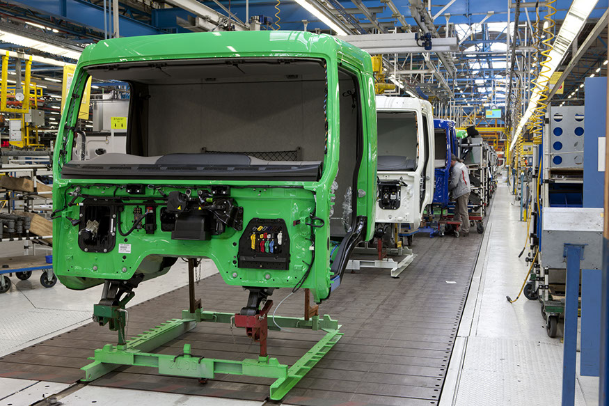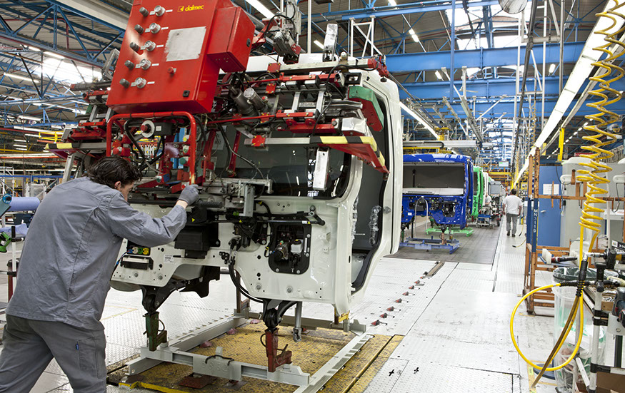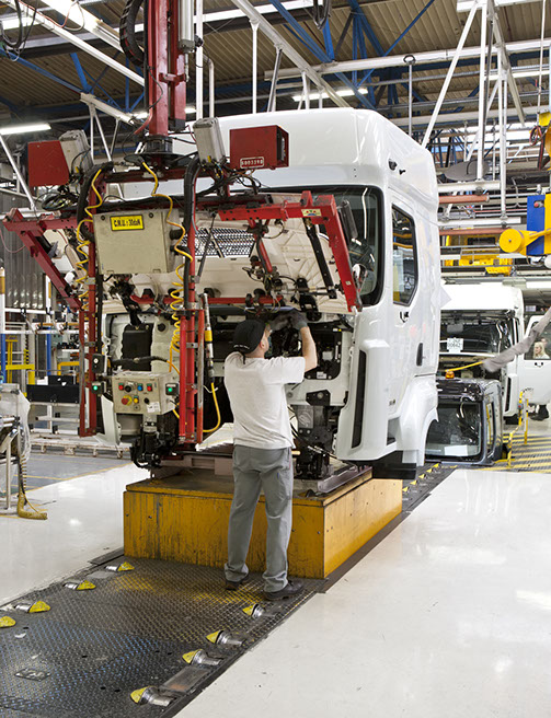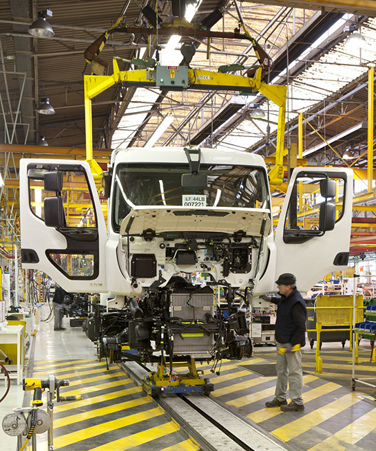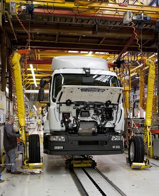 Usine de construction automobile, Renault Trucks, Blainville-sur-Orne. Sur le site de Blainville-sur-Orne, les ouvriers de Renault Trucks réalisent le montage complet des camions de la gamme Midlum. © Région Basse-Normandie – Inventaire général – Manuel de Rugy, 2012