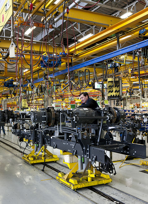 Usine de construction automobile, Renault Trucks, Blainville-sur-Orne. Le châssis du Midlum est composé des longerons et des essieux. © Région Basse-Normandie – Inventaire général – Manuel de Rugy, 2012