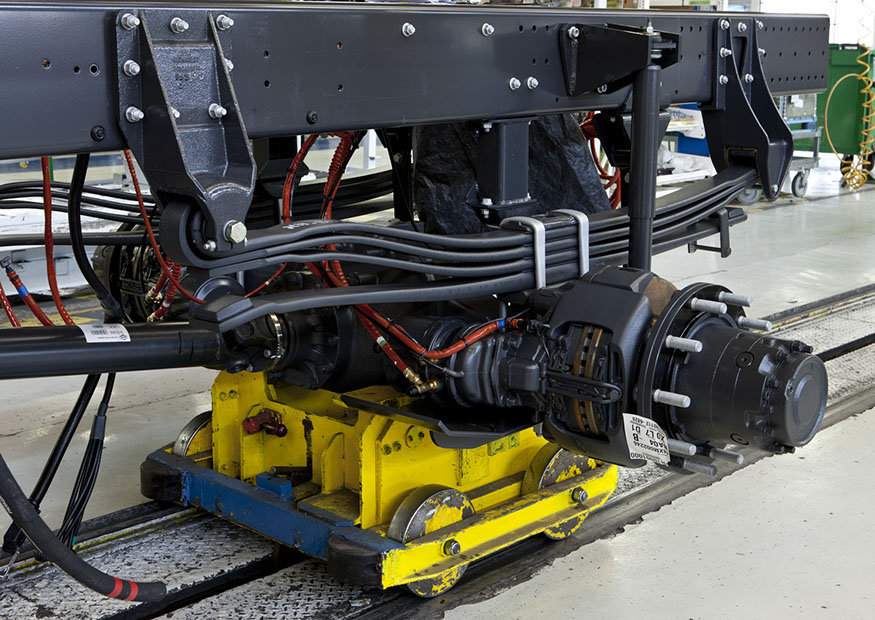 Usine de construction automobile, Renault Trucks, Blainville-sur-Orne. Châssis avec détail du longeron, des amortisseurs et de l'essieu moteur. © Région Basse-Normandie – Inventaire général – Manuel de Rugy, 2012