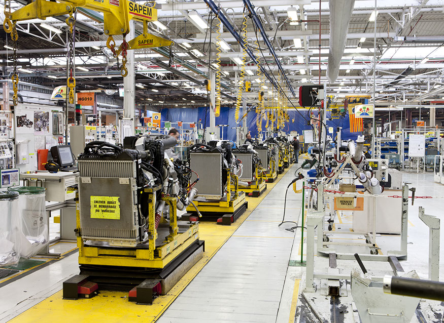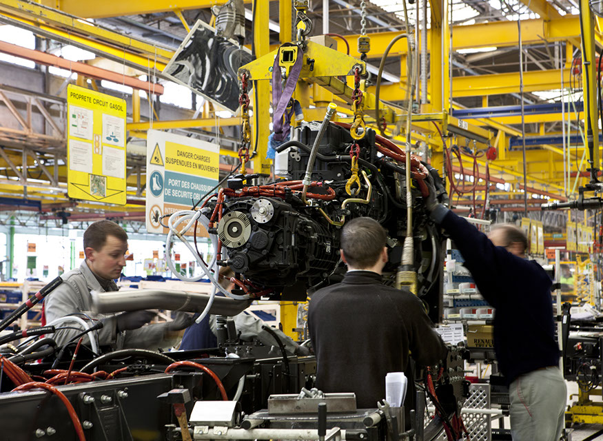 Usine de construction automobile, Renault Trucks, Blainville-sur-Orne. Amené via un système de poulies suspendues, le moteur est réceptionné et posé sur le châssis par une équipe d’ouvriers. © Région Basse-Normandie – Inventaire général – Manuel de Rugy, 2012