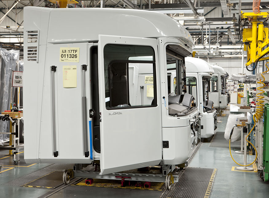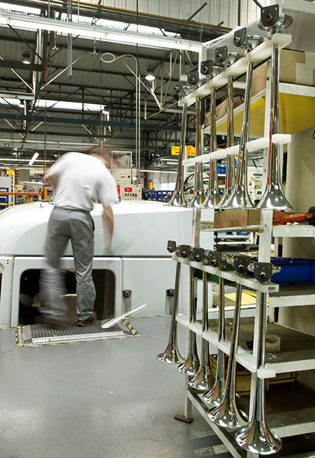 Usine de construction automobile, Renault Trucks, Blainville-sur-Orne. Chaque camion peut être muni d’options particulières comme l’ajout d’avertisseurs sonores, posés manuellement sur le toit de la cabine. © Région Basse-Normandie – Inventaire général – Manuel de Rugy, 2012