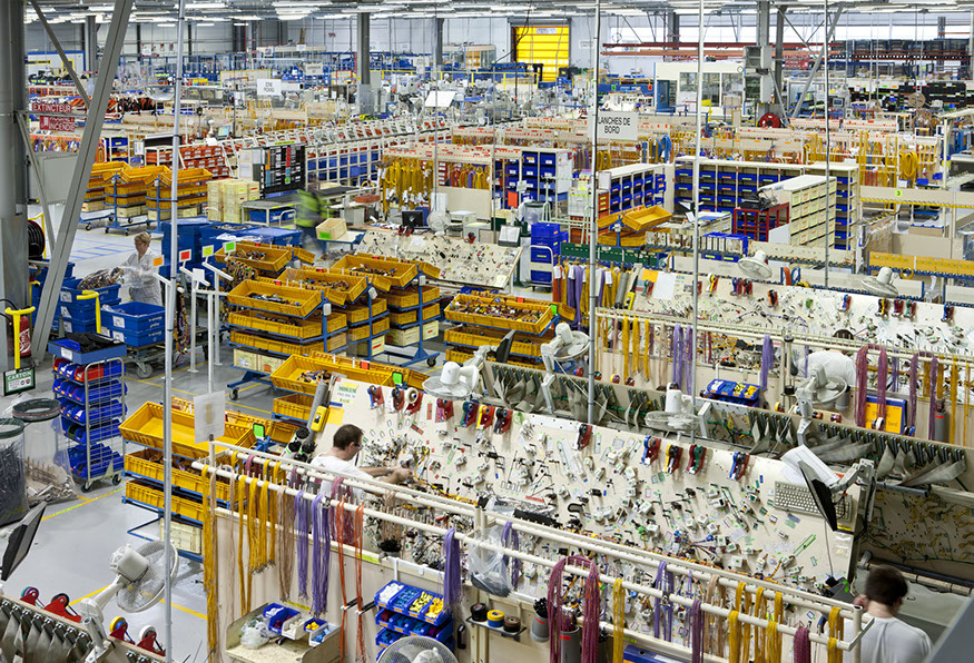 Usine de construction automobile, Renault Trucks, Blainville-sur-Orne. Les plans de travail de l’atelier des faisceaux peuvent être horizontaux ou verticaux. © Région Basse-Normandie – Inventaire général – Manuel de Rugy, 2012