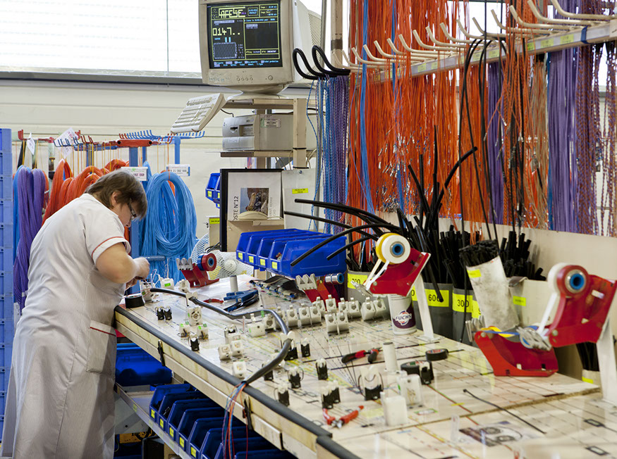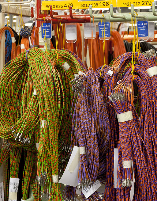 Usine de construction automobile, Renault Trucks, Blainville-sur-Orne. Une fois ordonnés, les faisceaux électriques équiperont les camions de la gamme Midlum. © Région Basse-Normandie – Inventaire général – Manuel de Rugy, 2012