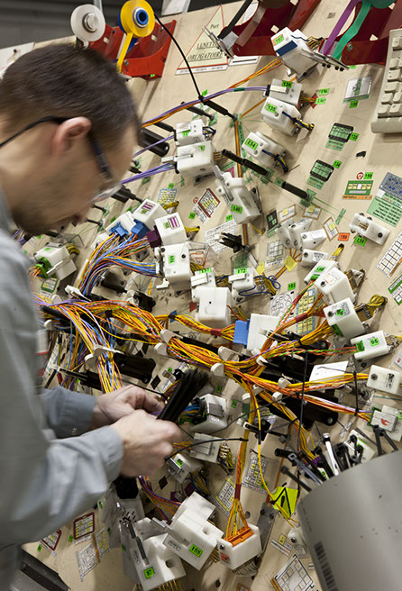 Usine de construction automobile, Renault Trucks, Blainville-sur-Orne. Formant des tresses de couleurs, les faisceaux électriques sont préparés sur place. © Région Basse-Normandie – Inventaire général – Manuel de Rugy, 2012
