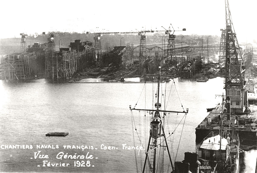 Usine de construction automobile, Renault Trucks, Blainville-sur-Orne. Vue générale des Chantiers navals français, avec les cales de construction et l’atelier des coques. Carte postale, février 1928. © Région Basse-Normandie – Inventaire général – Manuel de Rugy (reproduction)