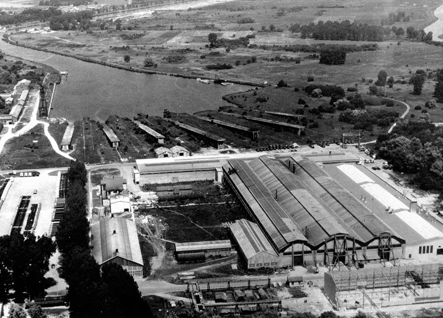 Usine de construction automobile, Renault Trucks, Blainville-sur-Orne. Vue aérienne des nefs, construites sur les plans d'Albert Caquot, des cales et du bassin des Chantiers navals français, prise du sud-ouest, vers 1960. © Région Basse-Normandie – Inventaire général – Copaviem (reproduction)