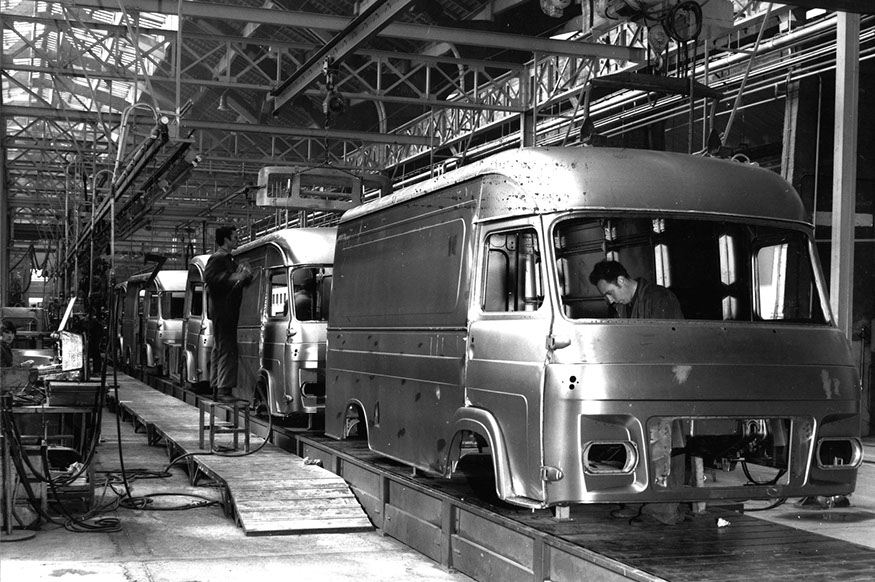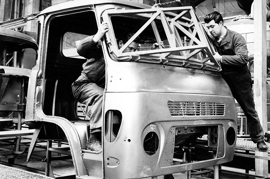 Usine de construction automobile, Renault Trucks, Blainville-sur-Orne. Pose d'un pare-brise sur une camionnette SAVIEM dans l’ancien atelier des coques, vers 1965. © Région Basse-Normandie – Inventaire général – Copaviem (reproduction)